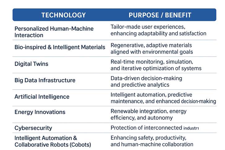 These technologies collectively enable the integration of human-centricity, sustainability, and resilience into industrial operations.